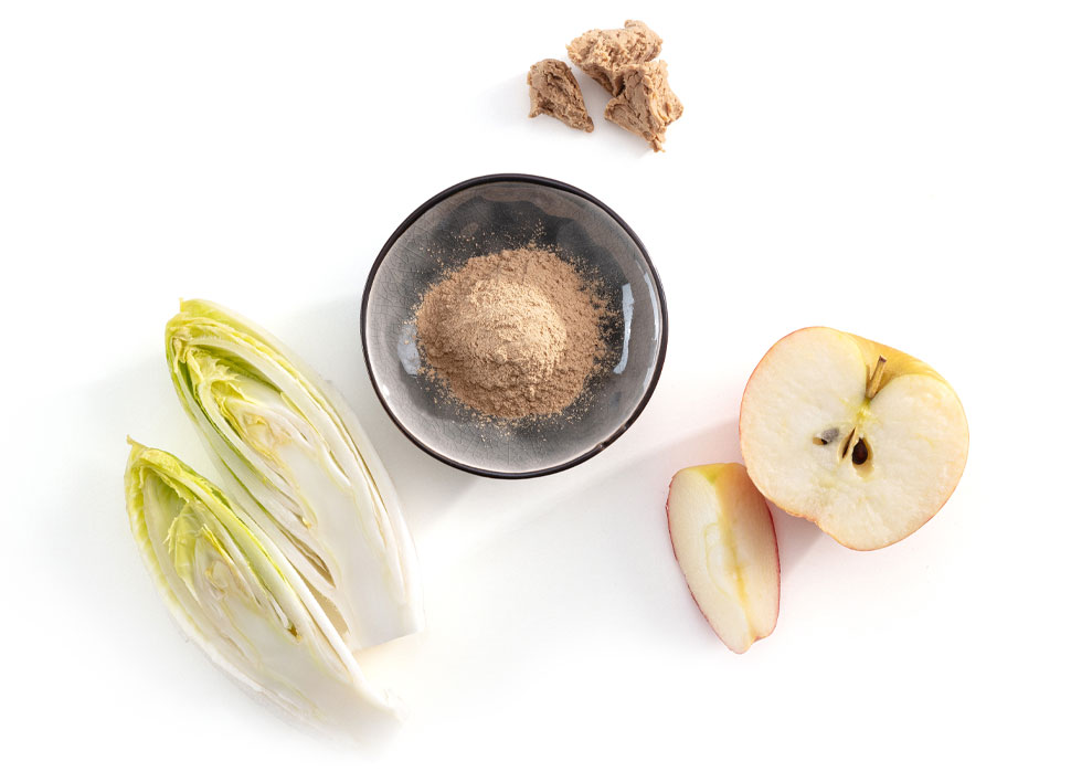 Hefe (48%, getrocknet), Zichorien-Inulin (30%), Apfelfaser (20%).