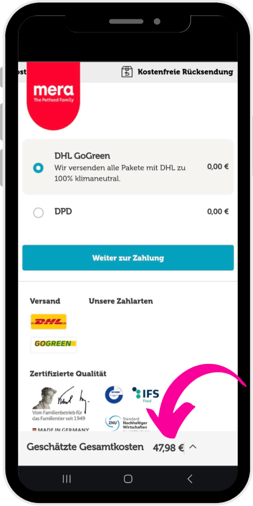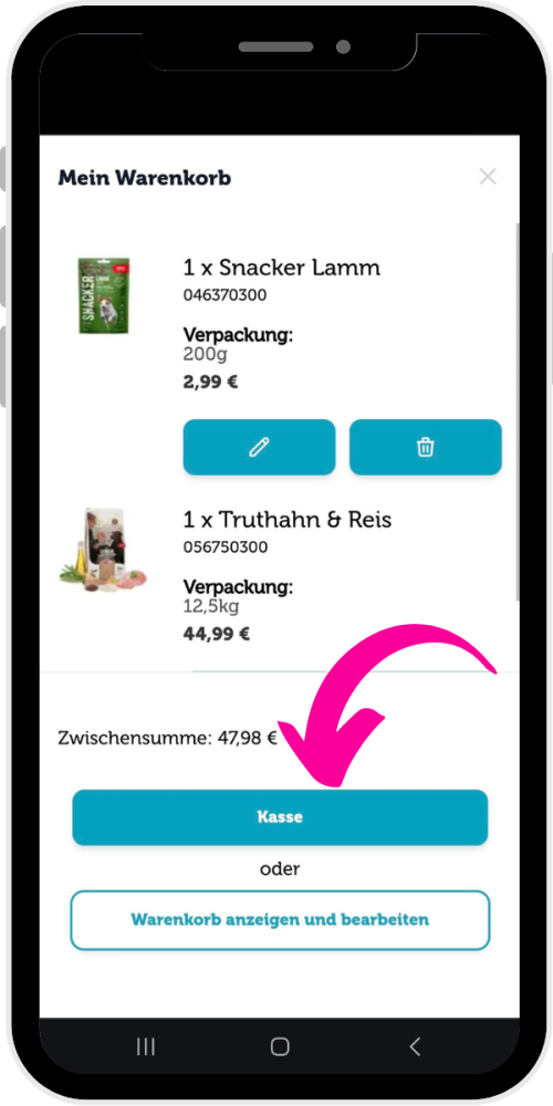 Gehe zur Bestellübersicht, indem du auf den Gesamtpreis klickst.