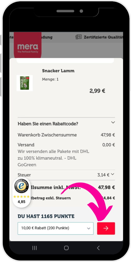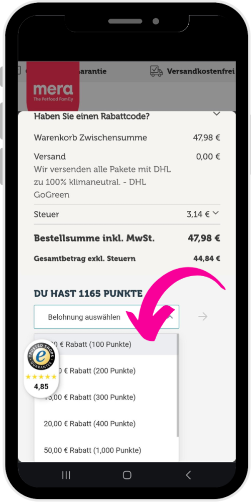 Scrolle runter und wähle eine Belohnung aus. Der Rabattbetrag wird dir im nächsten Schritt abgezogen.