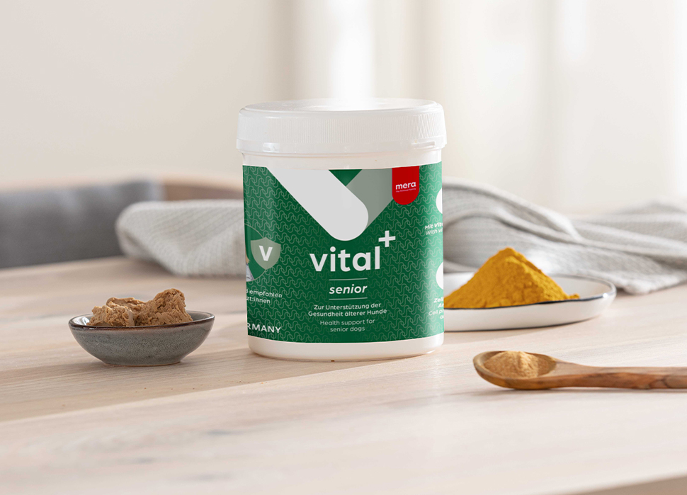 vital+ senior - die ideale Ergänzung zu jedem Hundefutter, sei es nass oder trocken. Unser Nahrungsergänzungsmittel ist extra an die Bedürfnisse von älteren Hunden angepasst. Es wird einfach über das Futter gestreut und unterstützt ältere Hunde auf natürliche Weise.